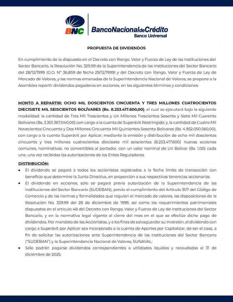En cumplimiento de lo dispuesto en el Decreto con Rango, Valor y Fuerza de Ley de las Instituciones del Sector Bancario, la Resolución No. 329.99 de la Superintendencia de las Instituciones del Sector Bancario del 28/12/1999 (G.O. Nro. 36.859 de fecha 29/12/1999) y del Decreto con Rango, Valor y Fuerza de Ley de Mercado de Valores, y las normas emanadas de la Superintendencia Nacional de Valores, se propone a la Asamblea repartir dividendos pagaderos en efectivo y en acciones, en los siguientes términos y condiciones: